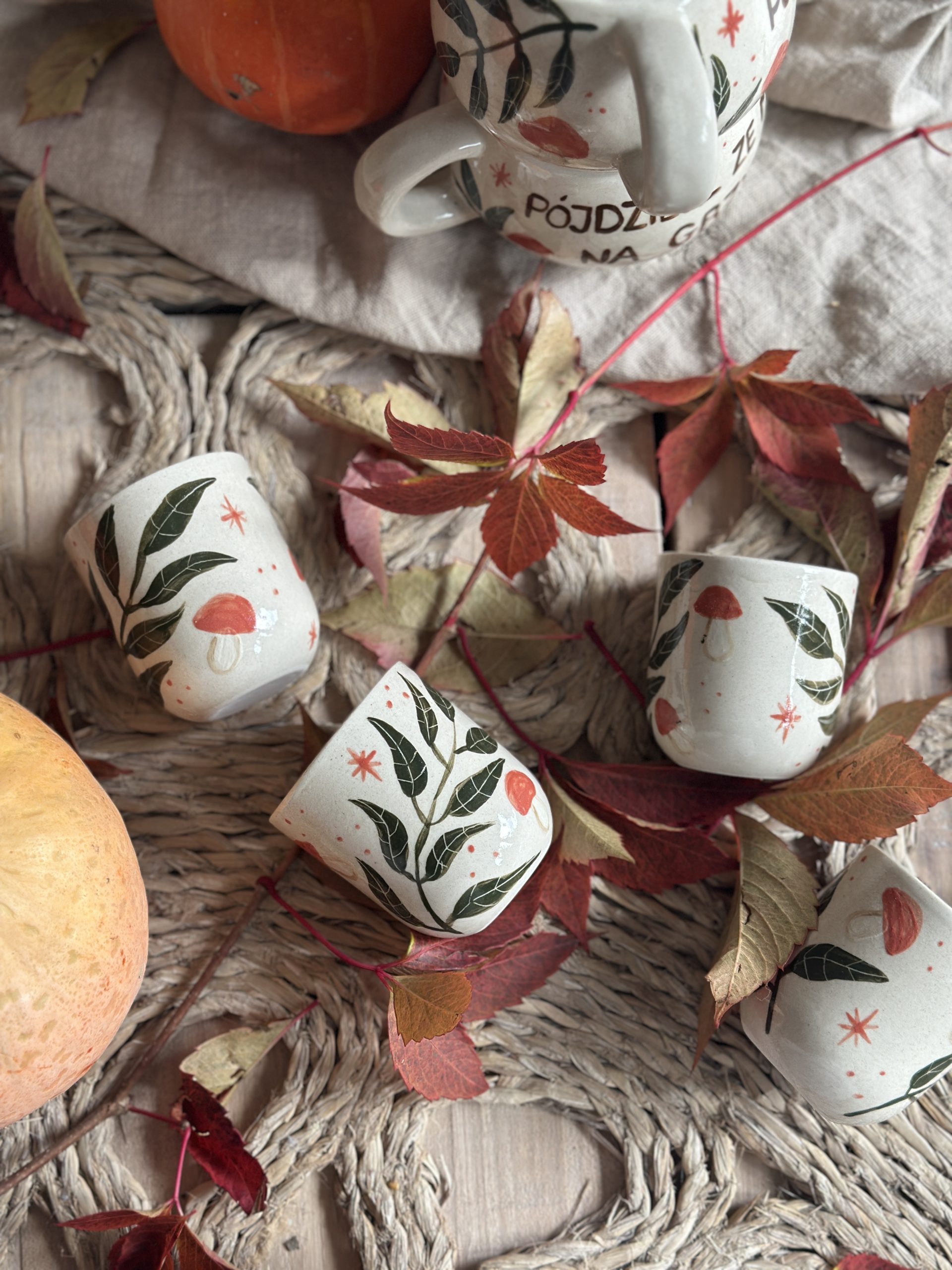 Ręcznie malowana czarka z jesiennymi grzybami i liśćmi. 150 ml jesiennego ciepła zamknięte w kremowej ceramice z białym wnętrzem 🍂🍄