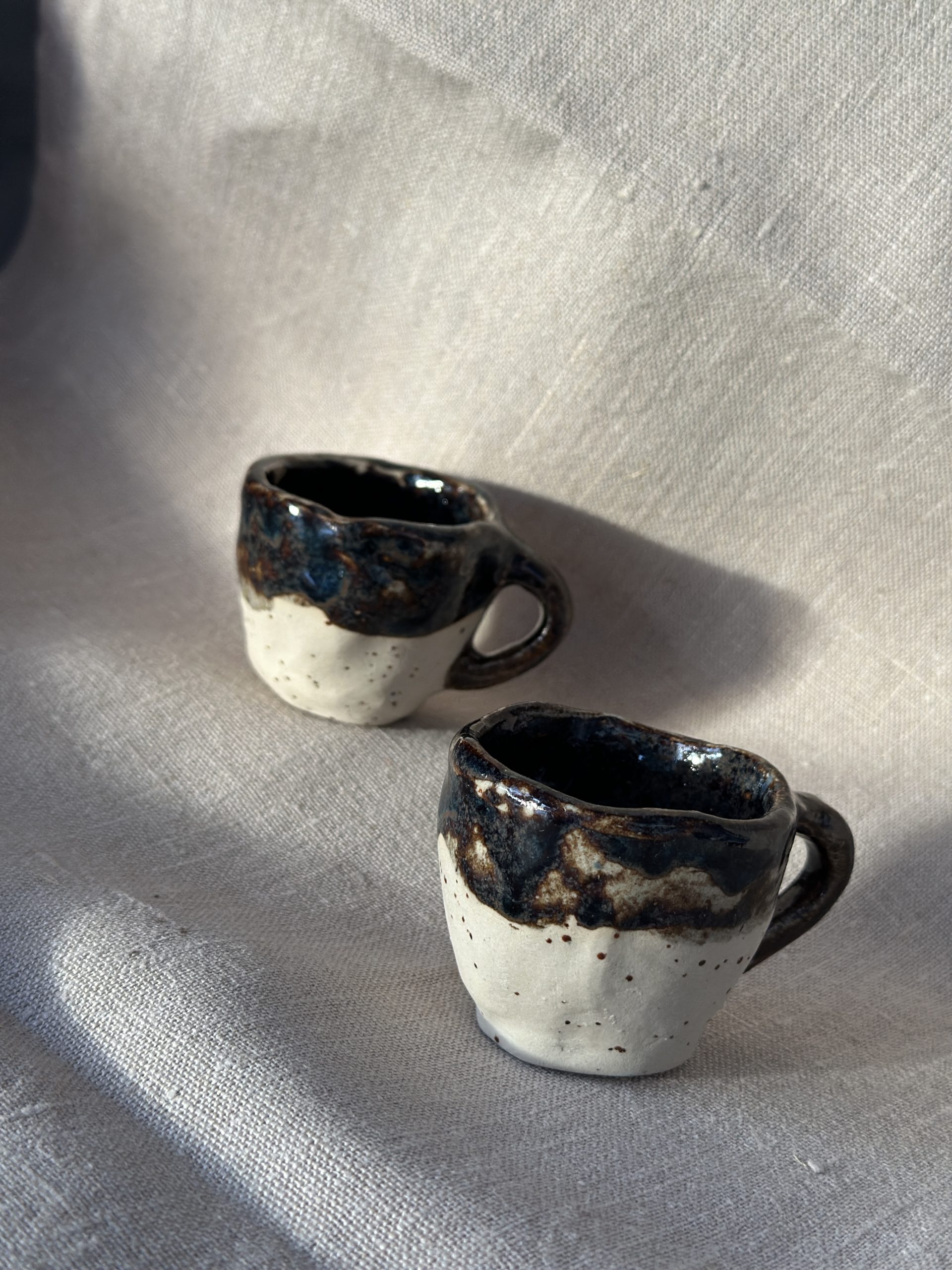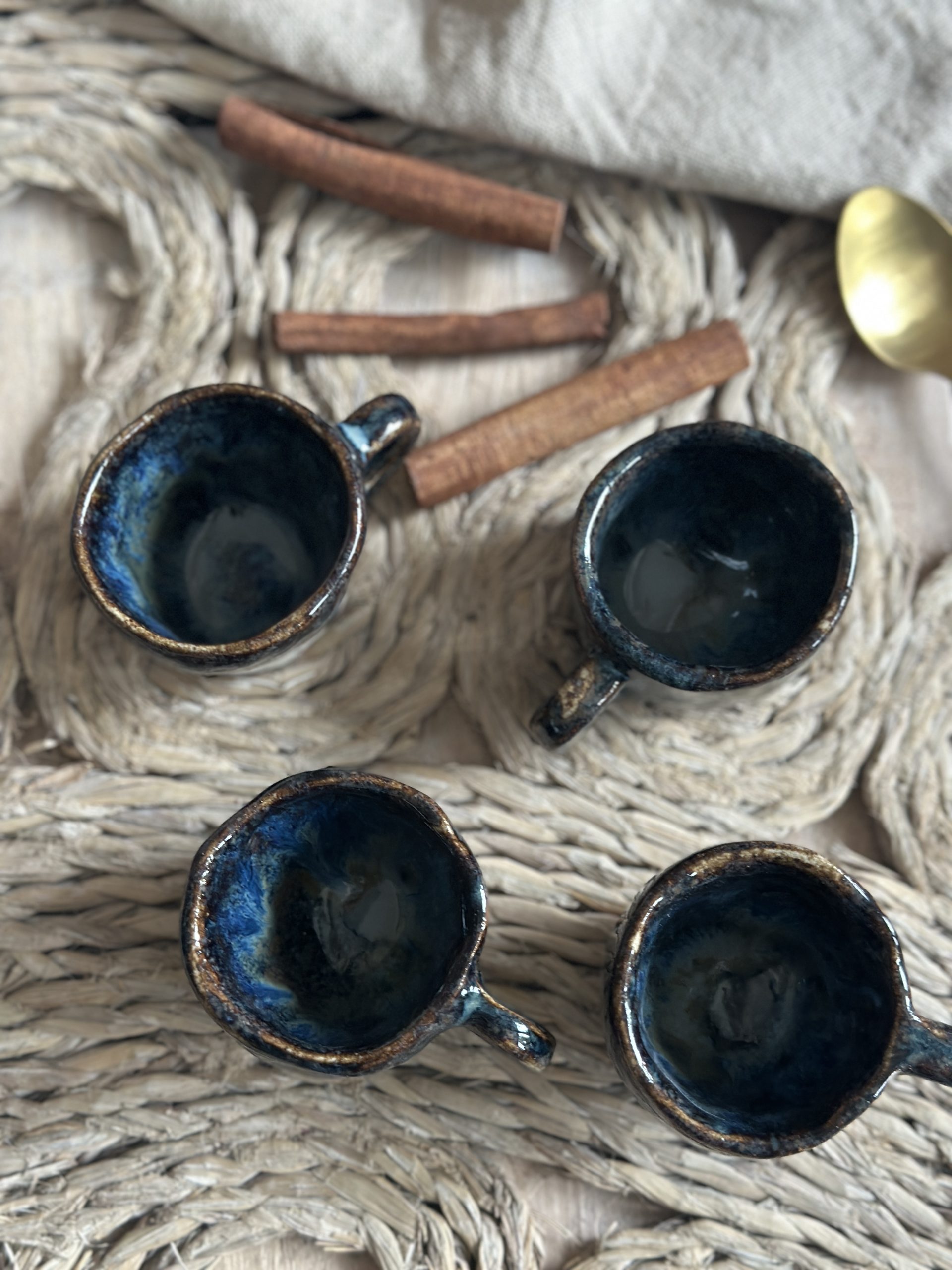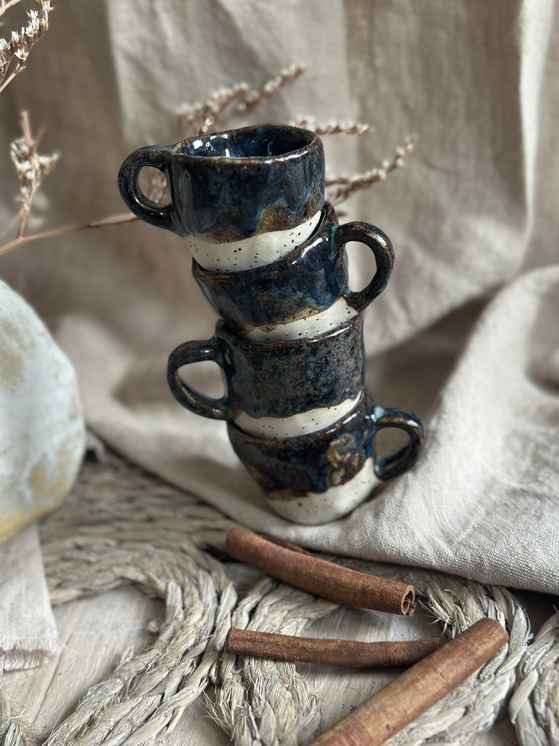 Każda ręcznie lepiona filiżanka na espresso z kolekcji Kosmiczna Noc powstaje z gliny w delikatne kropeczki, które dodają jej naturalnego uroku i rustykalnego charakteru. Wnętrze pokryte jest szkliwem w odcieniach granatu i głębokiego błękitu, z subtelnymi przejściami przypominającymi rozgwieżdżone niebo. Na zewnątrz szkliwo tworzy lekkie zacieki, dzięki czemu każda filiżanka jest absolutnie unikalna.