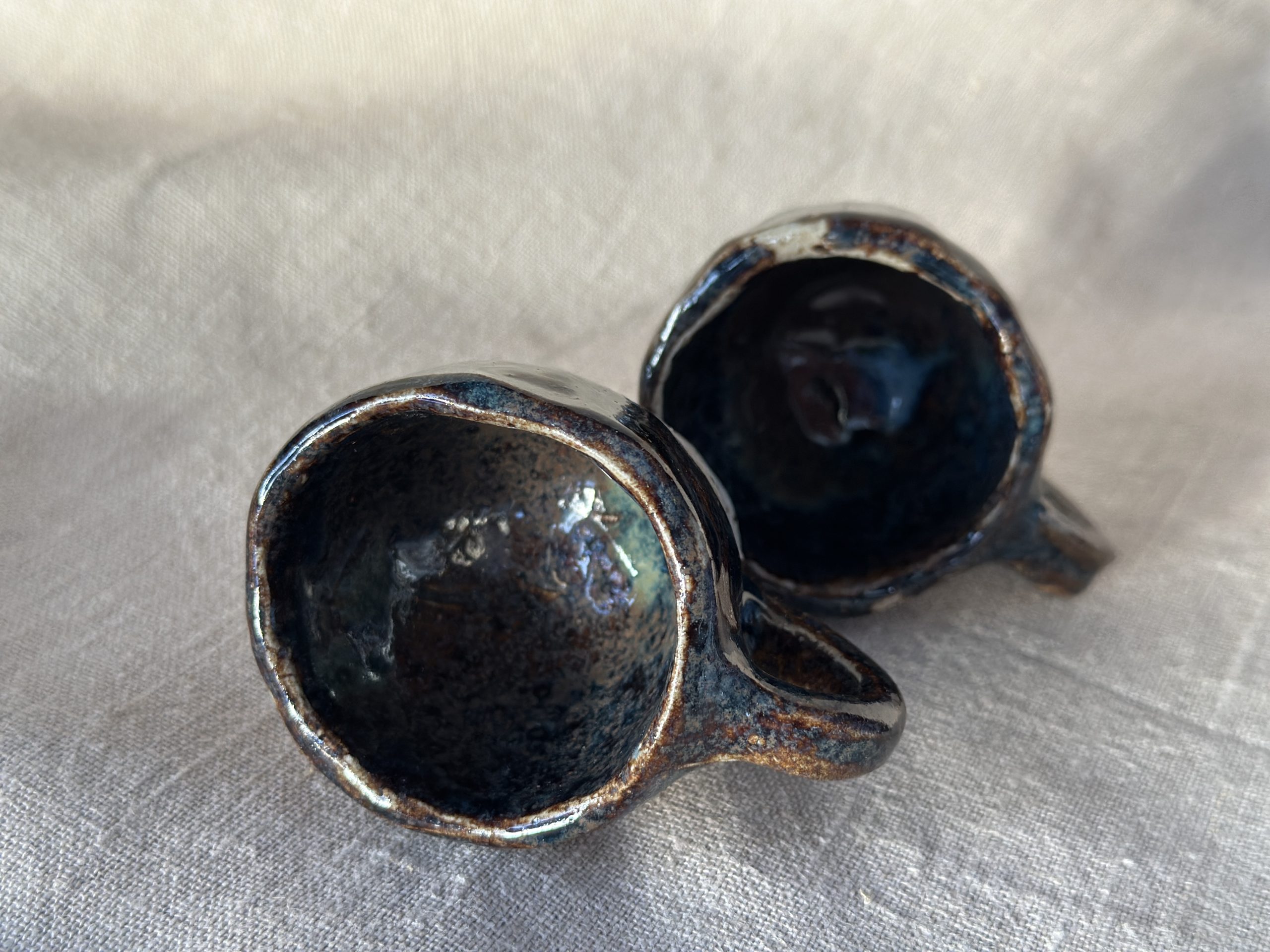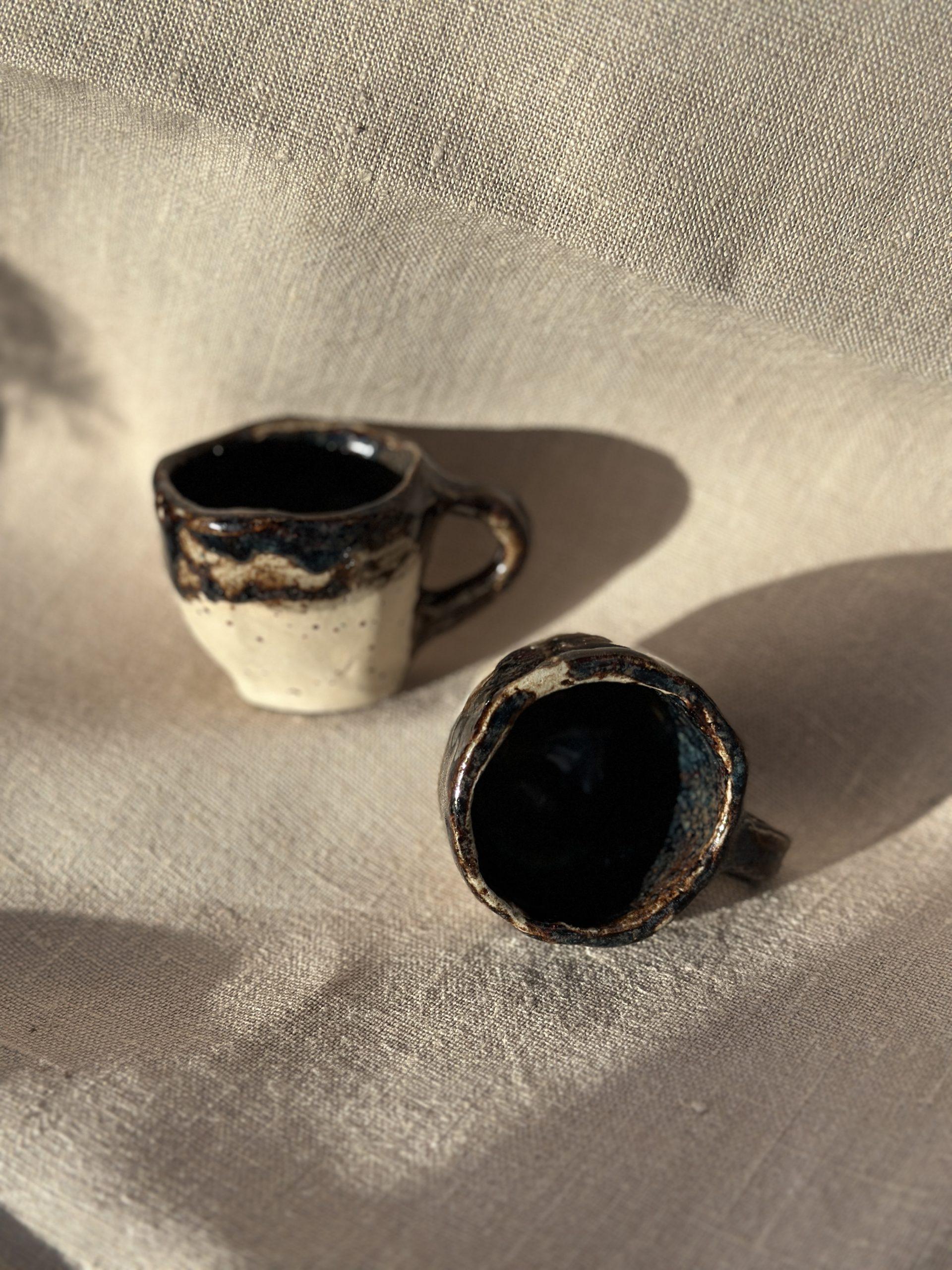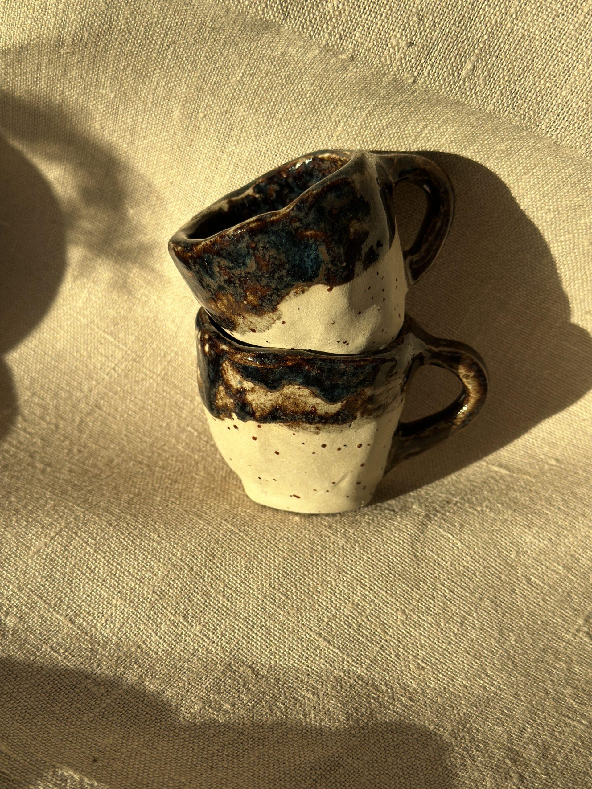 Każda ręcznie lepiona filiżanka na espresso z kolekcji Kosmiczna Noc powstaje z gliny w delikatne kropeczki, które dodają jej naturalnego uroku i rustykalnego charakteru. Wnętrze pokryte jest szkliwem w odcieniach granatu i głębokiego błękitu, z subtelnymi przejściami przypominającymi rozgwieżdżone niebo. Na zewnątrz szkliwo tworzy lekkie zacieki, dzięki czemu każda filiżanka jest absolutnie unikalna.